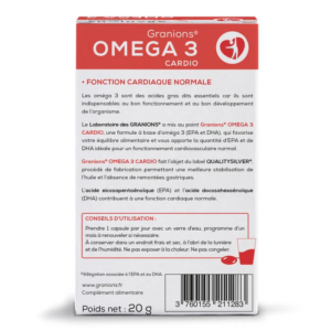 Le Laboratoire des Granions a mis au point Granions Omega 3 Cardio, une formule à base d’oméga 3 (EPA et DHA), qui favorise votre équilibre alimentaire et vous apporte la quantité d’EPA et DHA idéale pour un fonctionnement cardiovasculaire normal.