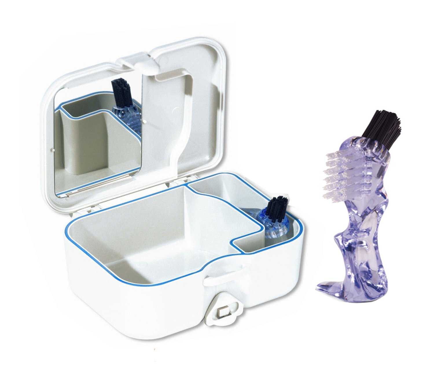 Boîte pour le rangement sûr des prothèses avec brosse pour prothèses de forme ergonomique