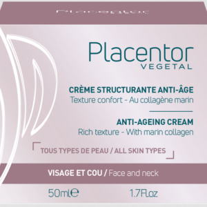 La Crème structurante anti-âge, à la texture confort, nourrit la peau durablement tout en apportant une action anti-âge globale (rides, fermeté). La peau est réparée dès 2 jours*. Convient aux peaux sensibles.- Placenta végétal : stimule la régénération cellulaire et répare la peau dès 2 jours. Apporte une hydratation immédiate et durable. Entraîne un effet lissant du micro relief cutané.