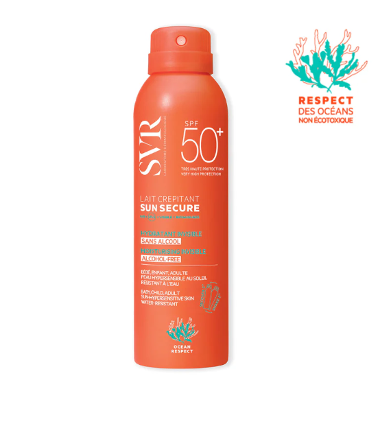 Son plus ? SUN SECURE Lait crépitant SPF50+ respecte l’environnement marin. Il a passé les tests d’éco-toxicité sur des algues (ISO 10253) et sur des invertébrés aquatiques (ISO 14669). Deux espèces appartenant à la famille des zooplanctons et phytoplanctons, indispensables au bon développement des coraux.