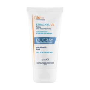 Le SOIN SOLAIRE KERACNYL UV Fluide anti-imperfections protège la peau grâce à des filtres UVA/UVB brevetés offrant un SPF50+.