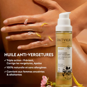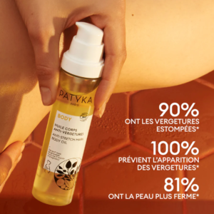 L’Huile Corps Anti-vergetures : prévient l’apparition, corrige et estompe les vergetures présentes. Elle apaise les sensations d’inconfort et protège la peau.