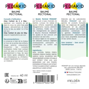 Le Baume Pectoral PEDIAKID® est formulé à base d’extraits de plantes : Thym, Lavande, Romarin et Mauve Blanche. Lorsque les bébés et jeunes enfants ressentent des désagréments quand viennent les premiers froids ou, lors des changements de saisons, le Baume Pectoral PEDIAKID® les apaise et leur procure une sensation de bien-être.