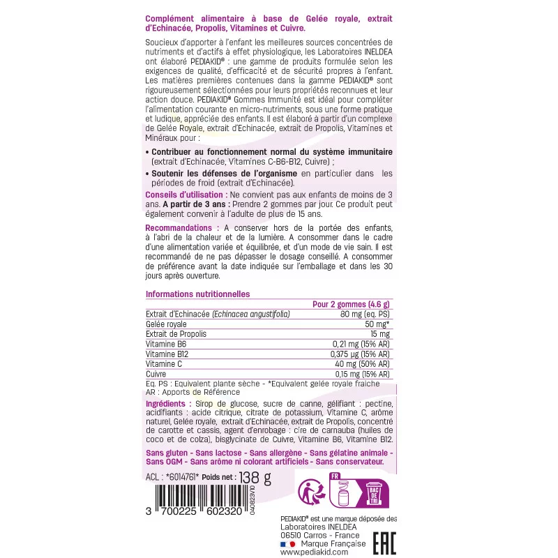 Les Gommes Immunité PEDIAKID® réunissent des actifs naturels rigoureusement sélectionnés pour leurs propriétés reconnues et leur action douce permettant de soutenir l’ensemble des défenses de l’organisme. Préconisées aux changements de saison, périodes propices aux refroidissements, elles sont élaborées à partir d’un complexe de Gelée Royale, extrait d’Echinacée, extrait de Propolis, vitamines et minéraux pour, d’une part contribuer au fonctionnement normal du système immunitaire (extrait d’Echinacée, Vitamines C, B6, B12, Cuivre) et d’autre part soutenir les défenses de l’organisme (extrait d’Echinacée). Les Gommes Immunité PEDIAKID® sontsans gélatine, sans gluten, sans lactose, sans conservateurs et sans arôme ni colorant artificiel. Une formule pratique, ludique et saine, idéale pour les enfants !