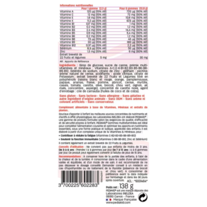 Les PEDIAKID® Gommes Multivitaminées associent 14 Vitamines et Minéraux et un extrait breveté de 22 Fruits & Légumes afin de garantir l’apport en micronutriments essentiels à l’enfant. Riches en Vitamines A, C, E, K, B1, B2, B3, B5, B6, B8, B9, B12, en Sélénium et Zinc, les PEDIAKID® Gommes Multivitaminées contribuent au bon fonctionnement du système immunitaire, des systèmes nerveux et psychologiques, et aident à réduire la fatigue.