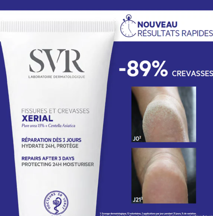 Le soin Xerial Fissures et Crevasses est le meilleur allié pour lisser, réparer, apaiser et protéger des agressions extérieures vos pieds abîmés et fendillés. Après une seule application, la peau est hydratée, nourrie et soulagée et 24h après, vos pieds sont hydratés et déjà plus lisses et plus confortables. L’un de ses actifs phares est la Centella Asiatica qui favorise la réparation épidermique. Ainsi, dès 3 jours, la peau est réparée et les zones de frottements sont moins endommagées. Sa texture fraîche enrichie en panthénol apaise immédiatement et durablement les sensations d’inconforts. Elle isole le pied des agressions extérieures prévenant ainsi l’apparition de nouvelles fissures et crevasses. Nourrissante et assouplissante grâce à l’huile de coco, elle laisse un fini non-gras et non-collant qui permet de mettre chaussures, chaussettes ou collants juste après l’application.